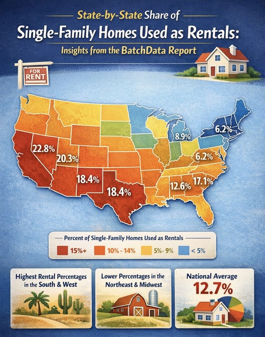 According to the BatchData report, some states have a significantly higher percentage of single-family homes being used as rentals. These states often experience strong population growth, higher investor activity, and competitive housing markets.